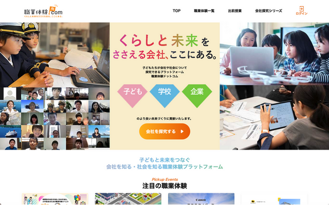 職業体験ドットコムは、子ども向けの職業体験イベントの掲載、出前授業の紹介、及び企業の事業活動やサステナビリティの取り組みから社会について探究できるプラットフォームです。Webサイト内の『会社探究シリーズ』は、Web情報教材として学校教育機関でもご利用いただいています。今後さらに、企業の掲載数と学校での活用を図り、一層に充実したコンテンツとして運用してまいります。