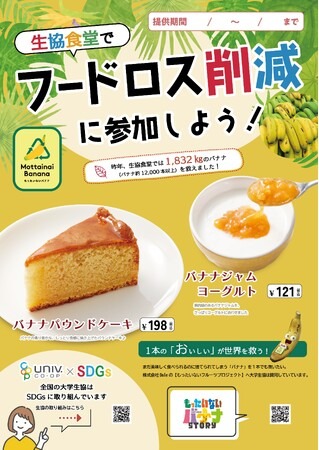第二弾となる今回は「生協食堂でフードロス削減に参加しよう!」をテーマに、果肉感のあるバナナジャムを、さっぱりヨーグルトに合わせた「バナナジャムヨーグルト」と、昨年に引き続き「バナナパウンドケーキ」の2品が、北海道大学や東北大学、東京大学、名古屋大学など、東日本エリアの、のべ85大学164店舗で提供されます。販売期間は、2026年1月12日(月)から1月24日(土)までを予定しています。