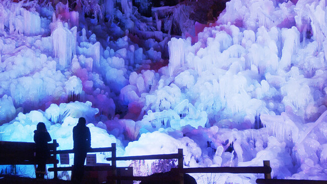 寒さが厳しい冬に出会える氷の光景。高さ30m/幅200mにわたって、壮大な氷の世界が広がります。芦ヶ久保駅から徒歩10分で、会場内すぐそばを電車が通るため、電車の車窓から氷柱を望むことができます。週末の夜にはライトアップされ、色とりどりに変化するその幻想的な空間は、自然の中の宝石箱のような輝きを放ちます。