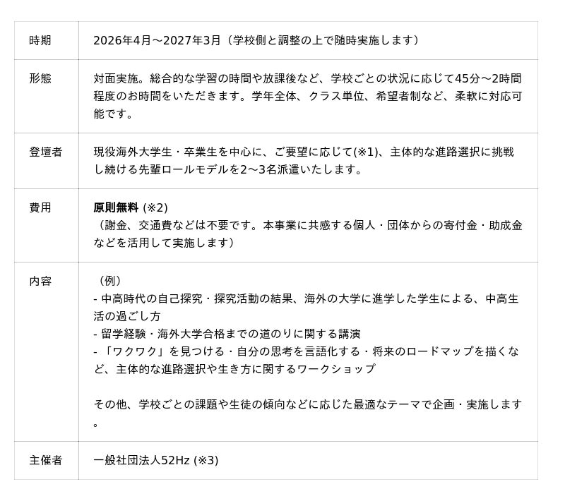 海外大学進学をはじめグローバルで主体的な進路選択を支援する一般社団法人52Hz(所在地:京都府京都市、代表:梅澤凌我、以下「52Hz」)は、2026年4月より、全国の中学・高校最大100校に現役海外大学生・海外大卒業生を派遣し、主体的な進路選択について考える出張授業を展開します。学校・教員などの皆さまからの公募に応じて、ハーバード大学・ミネルバ大学をはじめ世界20カ国以上の大学に進学した日本人学生が各校を訪問し、学校・生徒に負担の生じない原則無料のワークショップを全国各地で開催します。実施に先立ち、本日2026年1月7日より全国の学校・教員などの皆さまからの一般応募を開始します(詳細:下記フォーム)。