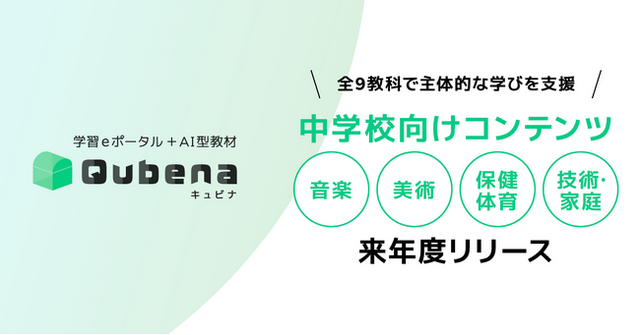 学習eポータル+AI型教材「キュビナ」を開発・提供する株式会社COMPASS(本社:東京都文京区、代表取締役:佐藤 潤、以下 COMPASS)はこのたび、現在提供している5教科(算数/数学、国語、理科、社会、英語)のコンテンツに加え、新たに中学校の音楽、美術、保健体育、技術・家庭の4教科に対応したコンテンツを開発、2026年度の提供開始を予定していることをご報告いたします。