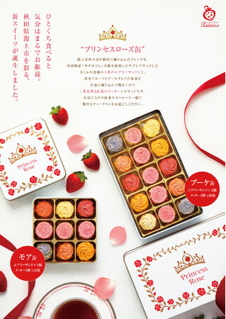 秋田県潟上市(市長:鈴木 雄大)は、地元の人気フルーツタルト専門店「パティスリーパルテール潟上本店(運営:株式会社ジェー・ユー)」と、新作の焼き菓子缶「プリンセスローズ ~苺のエアリーサンド~」を共同開発しました。