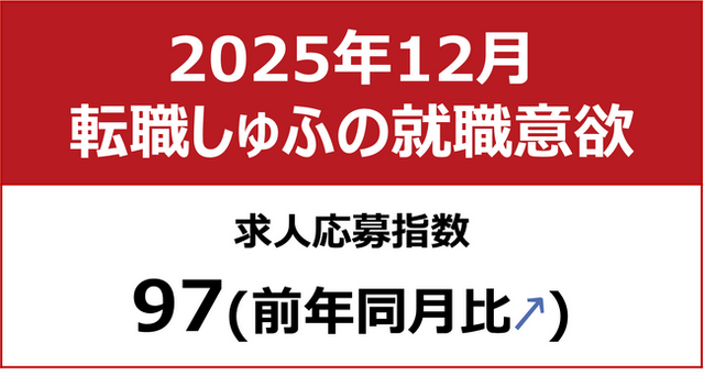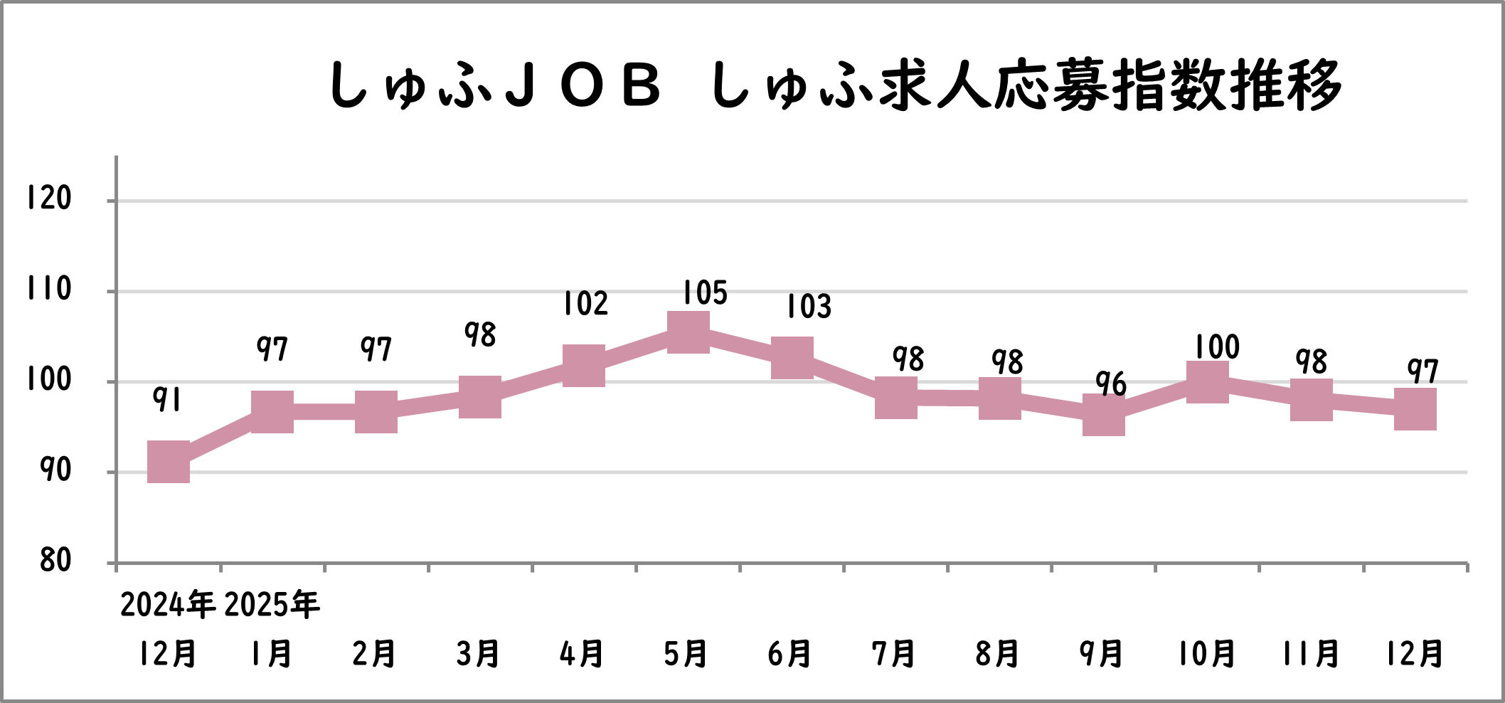 応募指数は前月比-1、前年同月比+6の97。前月と比較して、求人数は増加、応募数は減少しました。