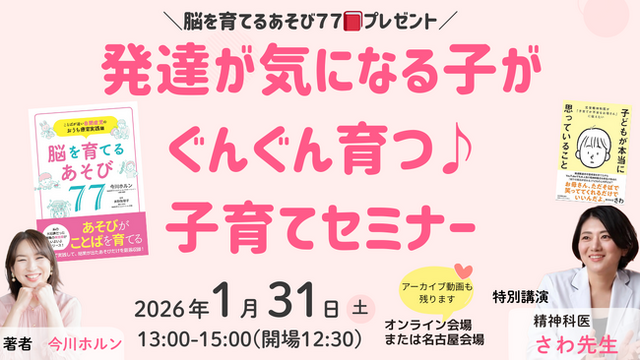 株式会社パステルコミュニケーション(本社:東京都豊島区、代表取締役:吉野加容子)は、親子のコミュニケーションをスムーズにして子どもの成長を加速する「発達科学コミュニケーション」講師・今川ホルンによる、出版記念セミナー「発達が気になる子が ぐんぐん育つ♪ 子育てセミナー」を、2026年1月31日(土)に名古屋(対面)およびオンライン(アーカイブあり)で開催します。