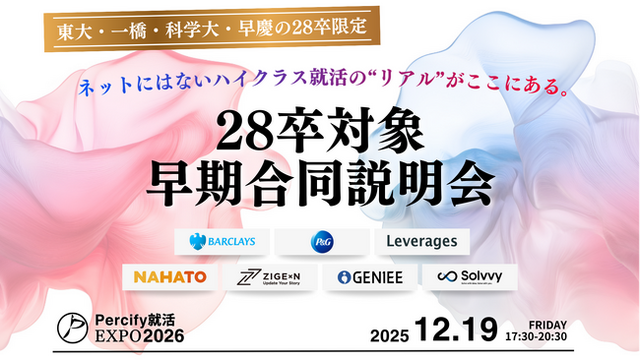 対象学生:東京大学・一橋大学・東京科学大学・早稲田大学・慶應義塾大学(これらの大学院も含む)を卒業予定の28卒学生