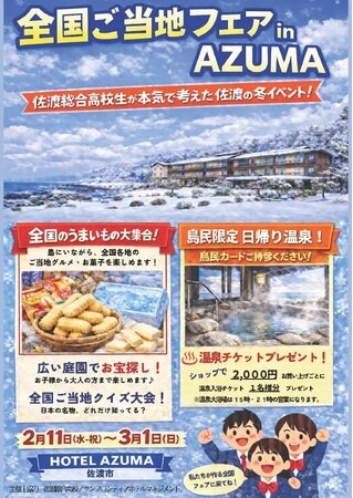 サンフロンティア不動産株式会社のグループ会社であるサンフロンティアホテルマネジメント株式会社(本社:東京都千代田区、代表取締役社長:柳村 一幸)と、サンフロンティア佐渡株式会社(本社:新潟県佐渡市、代表取締役社長:堀口 智顕、以下「当社」)は、2026年2月11日(祝・水)から3月1日(日)まで、佐渡総合高校2年生が企画した冬季の地域活性を目指す島民参加型イベント「全国ご当地フェア in AZUMA」を、当社が運営する「HOTEL AZUMA」(新潟県佐渡市)にて開催いたします。