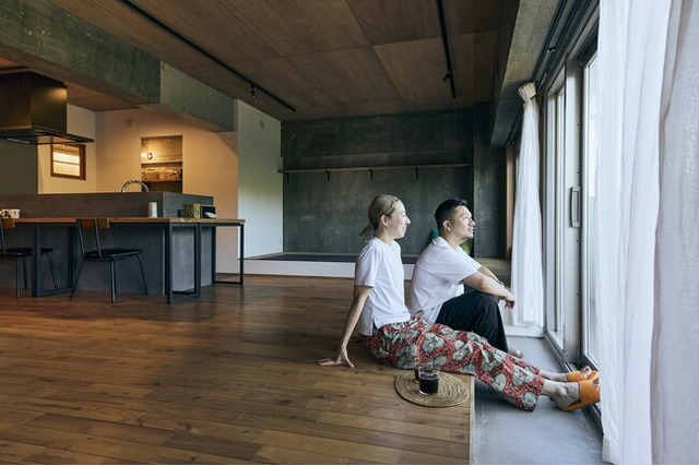 インナーバルコニーの土間スペースの窓は公園の緑が借景となり、コーヒーやお酒を飲む時間が日々の息抜きになる素敵な空間になりました。