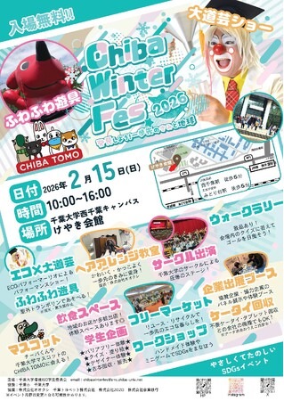 千葉大学環境ISO学生委員会は、千葉大学の学生や地域の住民の方に対して、エコやSDGsの意識を啓発すること、地域を活性化することを目的に、2026年2月15日(日)に千葉大学西千葉キャンパスにて「Chiba Winter Fes 2026~発見しよう!一歩先のきみと地球~」を開催します。