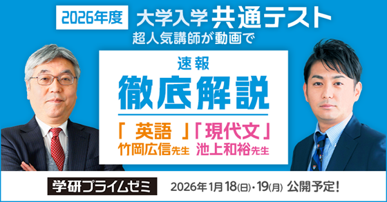 来る1月17・18日に実施される、共通テスト(令和8年度大学入学共通テスト)。「学研プライムゼミ」では、竹岡広信先生が「英語」を、池上和裕先生が「現代文」を解説した動画を速報にて無料公開します。今回の共通テストを受けた受験生の皆さんはもちろん、難関大を目指す高1・2年生の皆さんにとっても必見の動画です。
