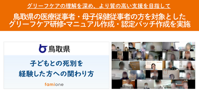 「子どもを願うすべての人によりそい 幸せな人生を歩める社会をつくる」をビジョンに掲げ、法人の従業員向け福利厚生や自治体の住民向け支援を行うヘルスケアサポートサービス「ファミワン」 https://famione.com/benefit/ などを展開する株式会社ファミワン(本社:東京都渋谷区、代表取締役:石川勇介)は、鳥取県(県知事:平井伸治)の医療従事者・母子保健従事者など当事者への支援に携わる方を対象に、2025年12月23日(火) に「子どもとの死別を経験した方への関わり方」をテーマとした従事者向けのグリーフケア研修及び交流会をオンラインで開催いたしました。