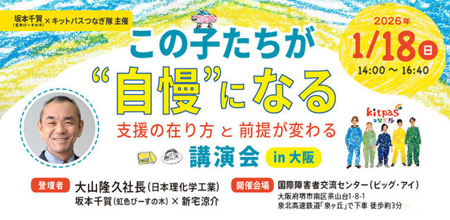 日本理化学工業株式会社(本社:神奈川県川崎市、代表取締役社長:大山隆久)は、2026年1月18日(日)に大阪府堺市の国際障害者交流センター(ビッグ・アイ)にて開催される講演会「この子たちが“自慢”になる ~支援の在り方と前提が変わる講演会~」に、代表の大山隆久が登壇することをお知らせいたします。