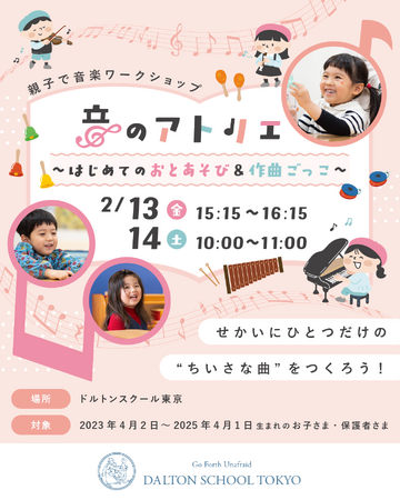 幼児・児童教育を行う河合塾学園ドルトンスクール東京校は、2023年4月2日~2025年4月1日生まれの児童とその保護者様を対象としたワークショップを2026年2月13日(金)・14日(土)に開催いたします。親子で季節の歌を楽しみながら、さまざまな音を鳴らして遊ぶ音楽イベントです。