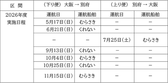 (下り)大阪発:12:15発 → 別府着 翌00:05着 / (上り)別府発:12:00発 → 大阪着23:50着