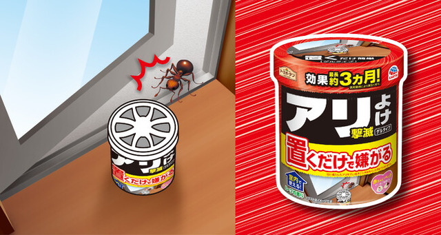 『アースガーデン アリよけ撃滅 ゲルタイプ』は、ご家庭の玄関、勝手口、窓際に置くだけでアリが嫌がり、侵入させないゲルタイプの忌避剤です。毎年アリが家に入ってきて困っている方や、赤ちゃんやペットがいるご家庭でアリ対策をしたいというお客様にぴったりな使いやすい新製品です。