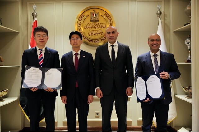 左から、常石博之(スプリックス代表取締役)、塚本康弘氏(在エジプト日本国大使館公使)、ムハンマド・アブデルラティーフ氏(教育・技術教育大臣)、アイマン・バハー・エル・ディーン氏(教育・技術教育副大臣)