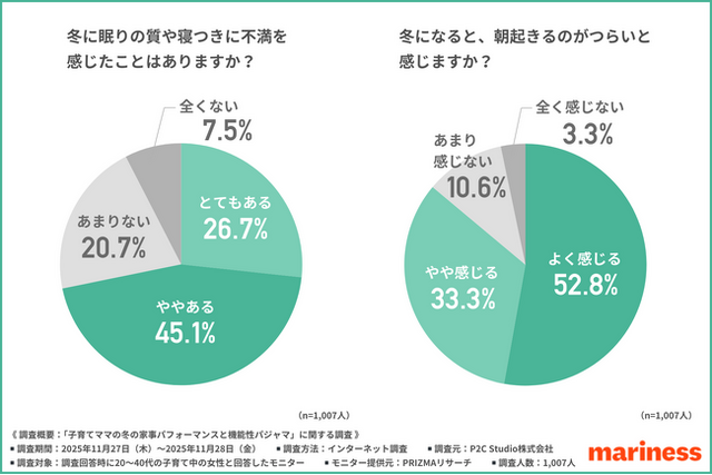 ウェルネスブランド「mariness」は、20~40代の子育て中の女性を対象に、「子育てママの冬の家事パフォーマンスと機能性パジャマ」に関する調査を行いました。