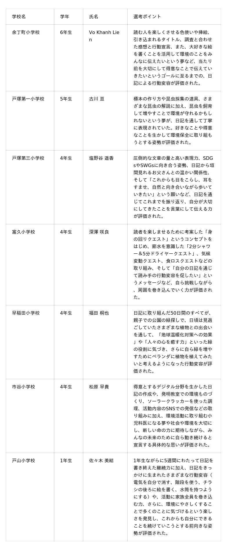 「未来を切り拓くで賞」は、自分の趣味や特技を活かした取り組みや、将来の夢に向けた前向きなメッセージなど、「未来を切り拓くこと」に関する優れた日記を書いた児童に贈られる賞です 。本年度は、独自の視点や高い探究心を持って環境活動に取り組んだ7名が選出されました。