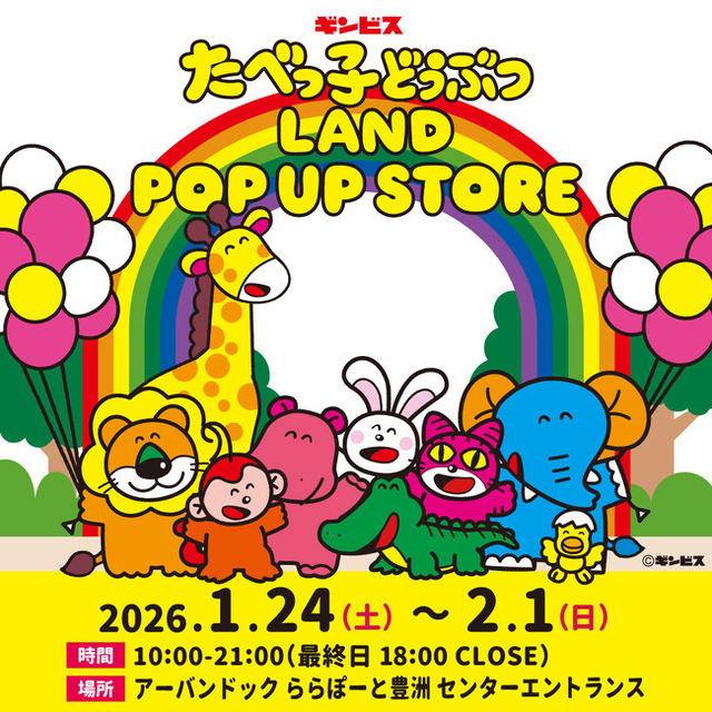 株式会社ギンビスのロングセラービスケット「たべっ子どうぶつ」の世界観が楽しめる体験型屋内イベント『たべっ子どうぶつLAND』が、ポップアップストア「たべっ子どうぶつLAND POP UP STORE」となって、1月24日(土)から2月1日(日)まで期間限定でアーバンドック ららぽーと豊洲に登場いたします。