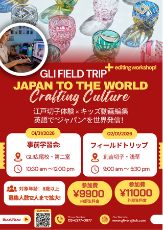 今回のフィールドトリップでは、東京・浅草にて日本の伝統工芸「江戸切子」を体験します。GLIがこの体験に江戸切子を選んだ理由は、世界から高く評価される「日本の美」が、伝統技術とその背景にある物語によって支えられているからです。単なる見学や制作にとどまらず、体験の様子を自ら撮影し、簡単な動画編集スキルを学び、完成した作品と学びを英語で世界に向けて発信します。実体験とアウトプットを通じて、日本文化の価値を自分の言葉で語れる力を育みます。