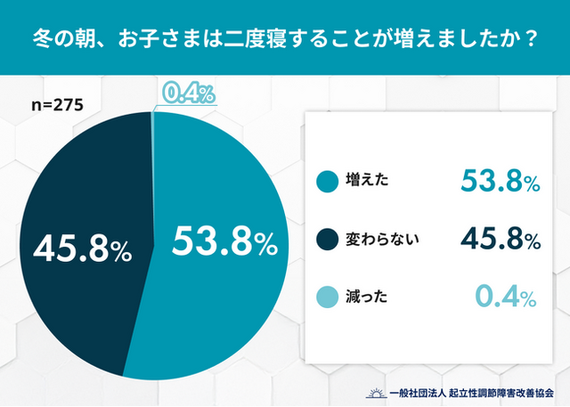 Q1. 冬の朝、お子さまは二度寝することが増えましたか?[画像1: https://prcdn.freetls.fastly.net/release_image/97246/16/97246-16-929534fc445c3000a411bd40ff0c9d9c-1074x767.png?width=536&quality=85%2C75&format=jpeg&auto=webp&fit=bounds&bg-color=fff ]
