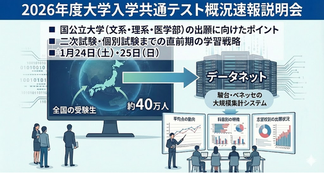 「データネット」は、全国の受験生約40万人の自己採点結果をもとにした、駿台・ベネッセによる集計システムです。本説明会では、集計直後の最新データを活用し、平均点の動向や科目別の特徴、志望校別の出願状況の見通しなどを分かりやすくお伝えします。