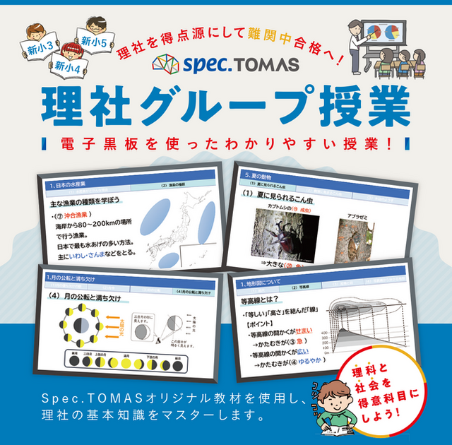株式会社リソー教育グループ(本社:東京都豊島区、代表取締役:天坊真彦)の子会社である、株式会社駿台TOMAS(本社:東京都豊島区、代表取締役:町田仁)は、最難関中学受験専門個別指導塾「スペックTOMAS」にて、新小3~新小5を対象に「理社グループ授業」を開講いたします。