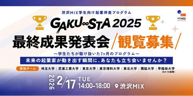 株式会社ツクリエ(本社:東京都千代田区 代表取締役:鈴木英樹 以下、ツクリエ)は、埼玉県のイノベーション創出拠点「渋沢MIX」のコンセプトの1つである「イノベーションを担う人材の育成」の一環として、学生のビジネスアイデアの事業化を支援する起業伴走プログラム「渋沢MIX学生向け起業伴走プログラム『GAKU∞STA(以下、ガクスタ)』」を受託運営しています。