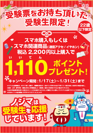 株式会社ノジマ(神奈川県横浜市、代表執行役社長・野島廣司)は、受験票をご提示かつスマホもしくはスマホ関連商品をご購入いただいた受験生を対象に合格を願って1,110(良い点)ポイントをプレゼントするキャンペーンを実施中です。現在新生活応援フェアも開催中のため、新入学や新生活準備についてノジマにお気軽にご相談ください。