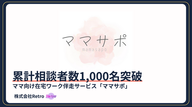 株式会社Retro(本社:東京都千代田区、代表取締役:三島誠司)が運営する、ママ向け在宅ワーク伴走サービス「ママサポ」は、サービス開始から累計相談者数が1,000名を突破したことをお知らせいたします。