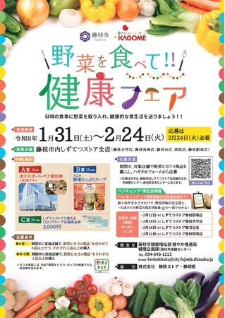 日頃の食事で野菜摂取を促し、健康的な食生活を支援するため、包括連携協定締結企業のカゴメ(株)と静岡県、しずてつストアと協働し、実施店舗で野菜とカゴメ商品を購入した人に特典を進呈する「野菜を食べて!!健康フェア」を開催します。