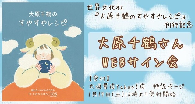 [画像7: https://prcdn.freetls.fastly.net/release_image/9728/2244/9728-2244-ffe7f79c6b26b75ef9f9937cad473ebc-1024x550.jpg?width=536&quality=85%2C75&format=jpeg&auto=webp&fit=bounds&bg-color=fff ]『大原千鶴のすやすやレシピ』の刊行を記念し、Yahooショッピング内「大垣書店Yahoo!店」限定で大原千鶴さんによるWEBサイン会を開催します。先着50様限定です。ふるってご応募ください。