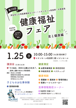 福岡県済生会二日市医療福祉センター(福岡県筑紫野市)は、イオンモール筑紫野、株式会社大賀薬局と共同で食と健康をテーマに地域住民の健康づくりを支援するイベント「健康福祉フェア」を1/25(日)イオンモール筑紫野にて開催します。