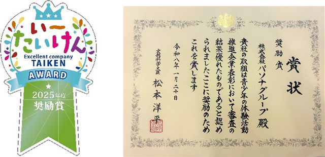 株式会社パソナグループ(本社:東京都千代田区、代表取締役会長CEO 若本博隆)はこの度、文部科学省が主催する令和7年度「いーたいけんアワード(青少年の体験活動推進企業表彰)」の大企業部門において、『奨励賞』を受賞いたしました。