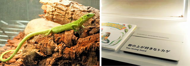 トカゲの展示には「⻘い舌のトカゲ」(マダラアオジタトカゲ)、「赤い顔のトカゲ」(ガイアナカイマントカゲ)など、来館者の観察をうながすキャプションがついています。今回の「ミドリガストロカナヘビ」は樹の上での生活を好む習性であることから「樹の上が好きなトカゲ」としています。トカゲたちの特徴や、それぞれの生態を比較しながら観察する展示に、樹上棲のトカゲが加わり、トカゲの多様性を伝える展示がより充実しました。