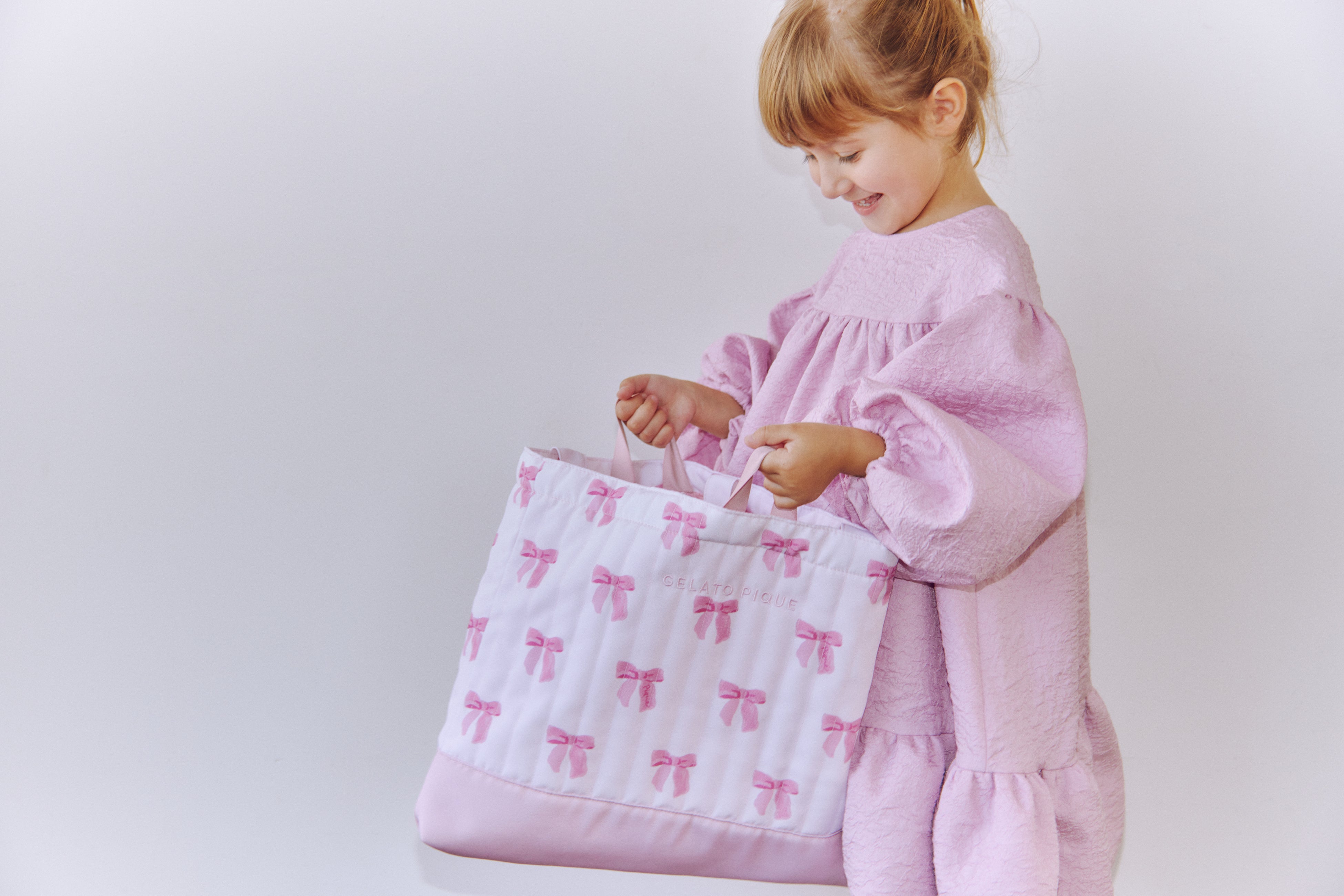 キルト生地のやわらかな質感と、思わず目を引く可愛らしいデザインが魅力のレッスンバッグ。