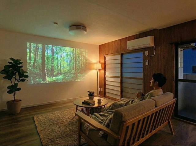 仕事帰り、コンビニの袋をテーブルに置いて、靴下のままソファに沈む。スマホでいつも通り動画アプリを開く--でも今日は、画面は見ない。天井の照明リモコンを押して、プロジェクターを起動。スマホをミラーリングすると、白い壁いっぱいにタイトル画面が広がった。部屋の明かりを少し落とすと、木目の壁が静かな影になって、スクリーンの光だけが際立つ。「どうせ観るなら、大画面で。」--その一手間が、“自分だけの劇場”に変える。