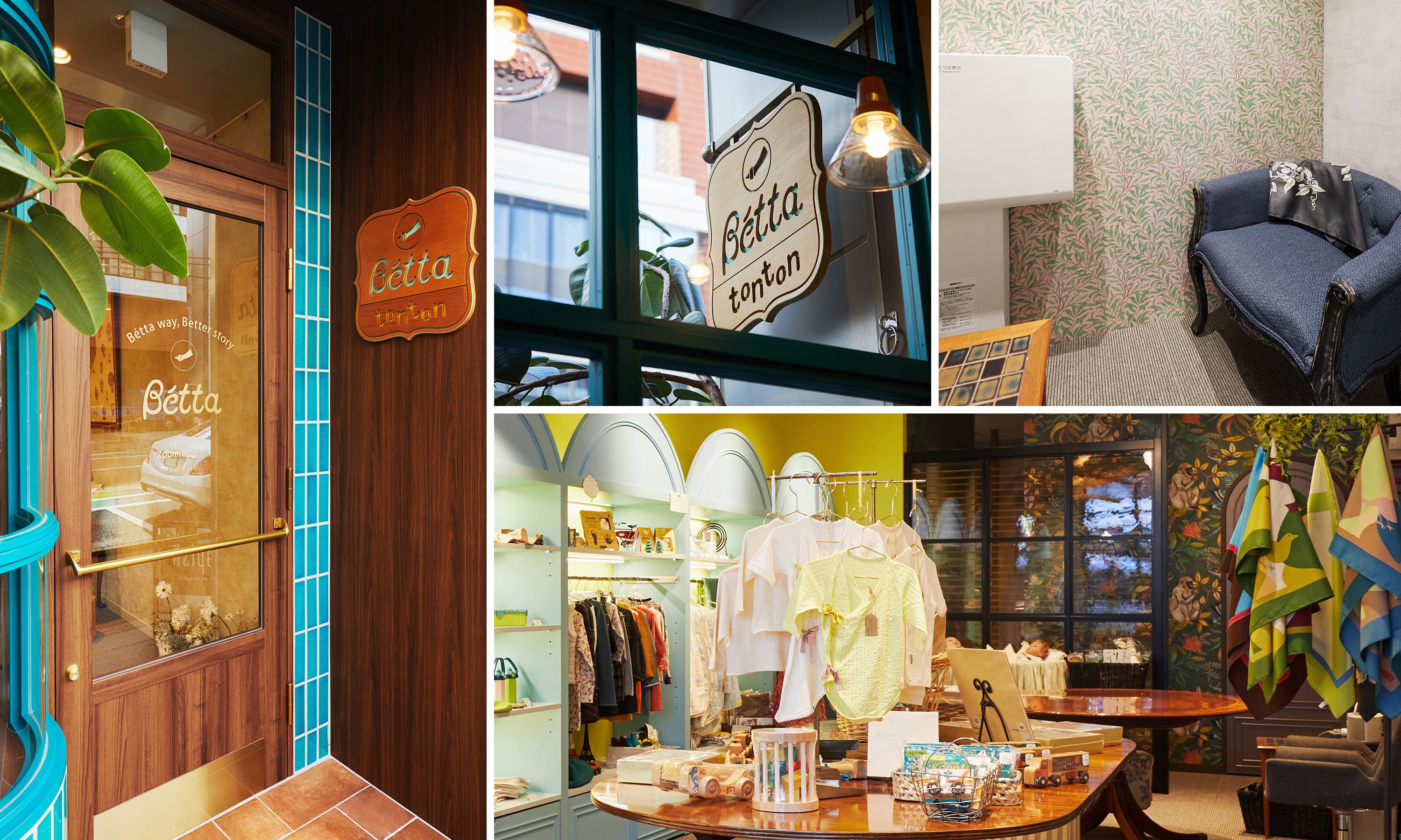 入り口は鮮やかなブルーのタイルとあたたかみのある木製扉がお出迎え。『Betta tonton』の看板が目印です。店内には授乳室やオムツ替えコーナーもあり、お買い物ついでに気軽にお立ち寄りいただけます。