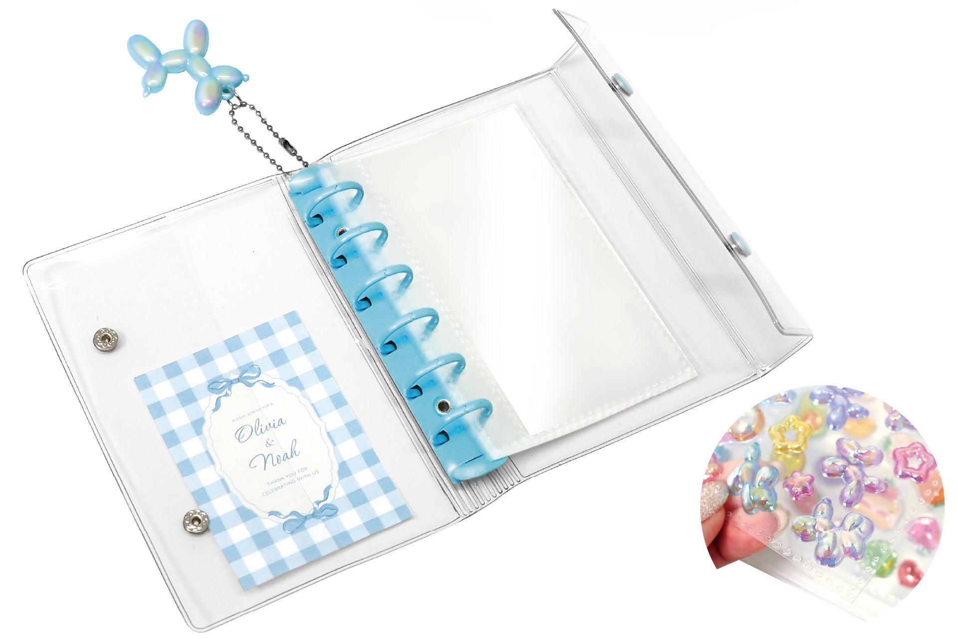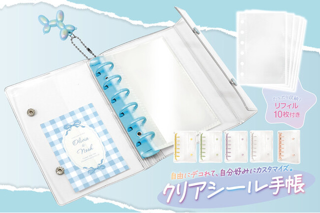 クリアシール手帳は豊富な6種のカラバリとチャームホールで世界観に合わせて自分好みにカスタマイズが可能。大容量シールとあわせて、シール交換を楽しもう!