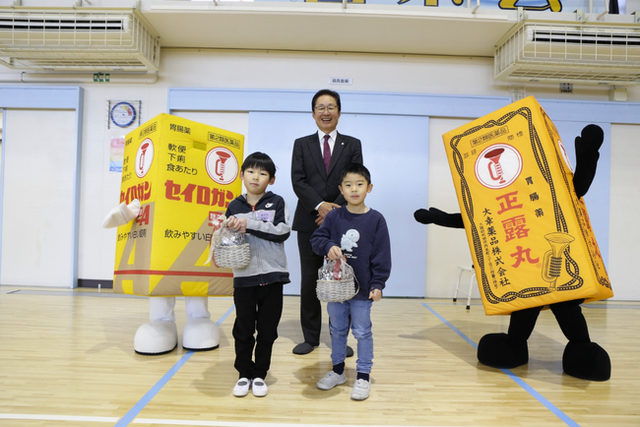 当日は全校集会の時間を活用し、防災ホイッスルの贈呈式が行われました。贈呈式では、 代表取締役社長の柴田 高が本取り組みの趣旨について説明しました。続いて、公式キャラクター「正露丸くん」「セイロガン糖衣Aちゃん」が、贈呈用の防災ホイッスルを手に登場し、会場を盛り上げました。