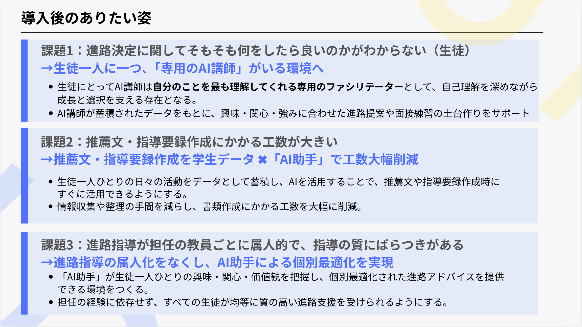 本事例は、高校の進路指導において教員個々の経験や進め方に依存しがちな状況を踏まえ、AIとデータを活用することで、属人化せず、すべての生徒に個別最適化された指導を提供することを目指した取り組みです。