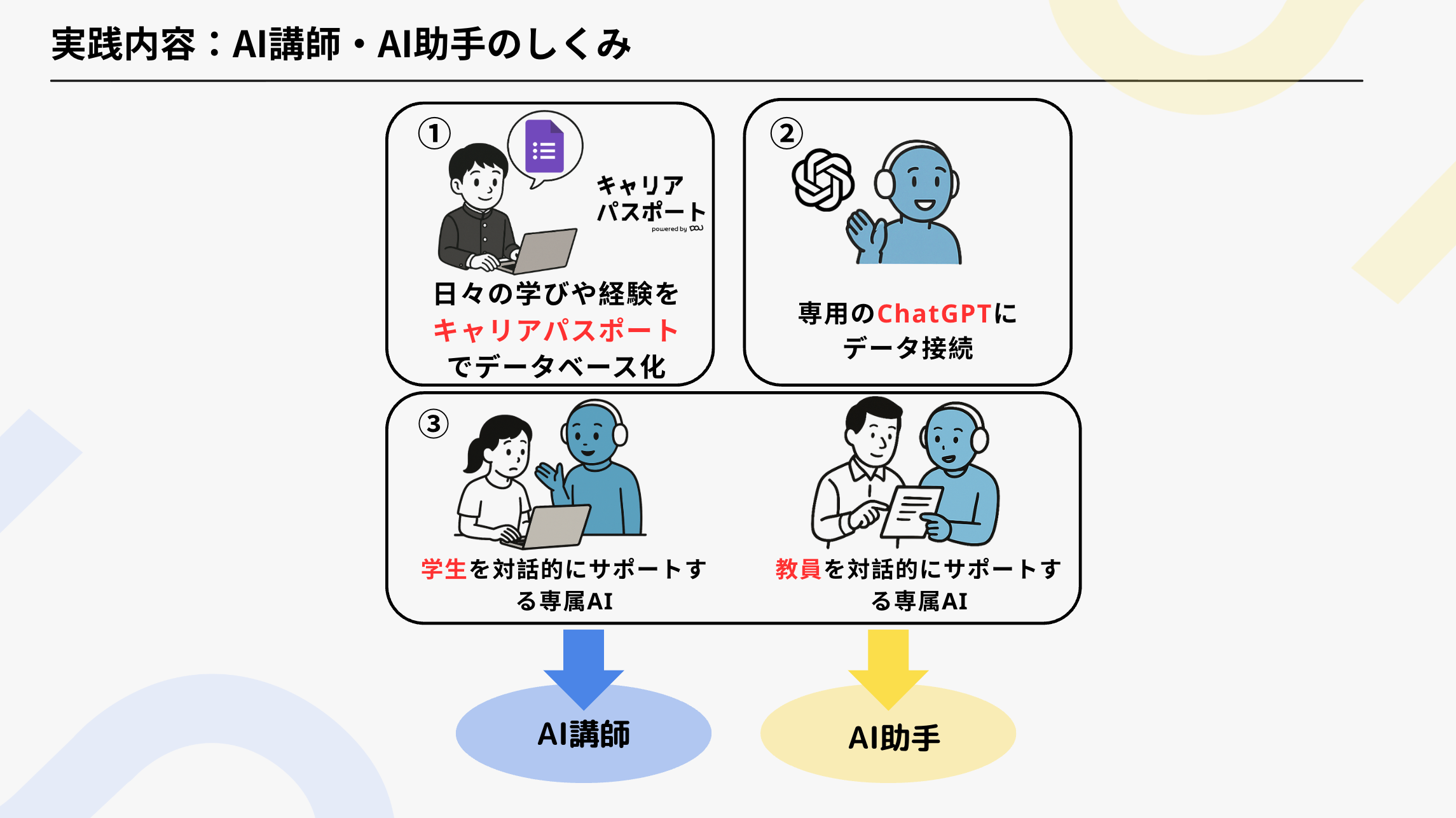 蓄積されたデータは、生徒向けの「AI講師」と教員向けの「AI助手」にそれぞれ連携され、進路指導の各場面で活用されます。