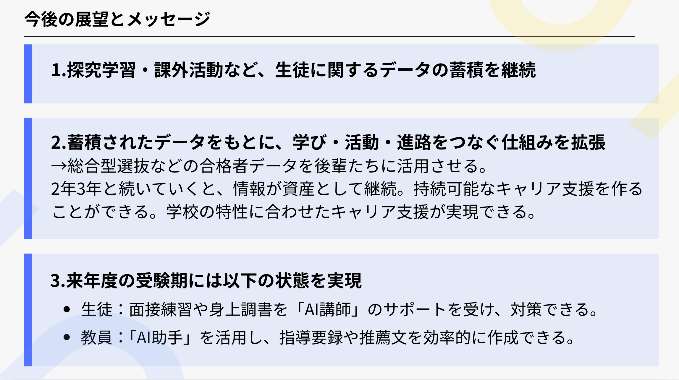 今後も、探究学習や課外活動をはじめとした、生徒に関するデータの蓄積を継続していく予定です。日々の学びや活動を記録として残し続けることで、生徒一人ひとりの成長過程を、時間軸を持って捉えられる環境を整えていきます。あわせて、蓄積されたデータをもとに、「学び・活動・進路」をつなぐ仕組みの拡張を進めていきます。総合型選抜などの合格者データや進路決定のプロセスを後輩たちの指導に活用することで、情報を単発で終わらせるのではなく、学校の資産として継承していくことを目指します。2年、3年と運用を重ねることで、持続可能なキャリア支援体制の構築につなげていく考えです。