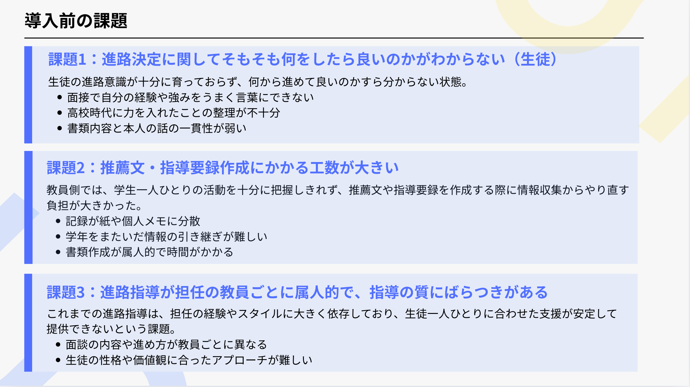 さらに、進路指導全体としては、担任教員の経験やスタイルに大きく依存しやすく、面談の進め方やアドバイスの内容が教員ごとに異なることで、生徒の性格や価値観に応じた支援を安定して提供することが難しい状況が生じています。