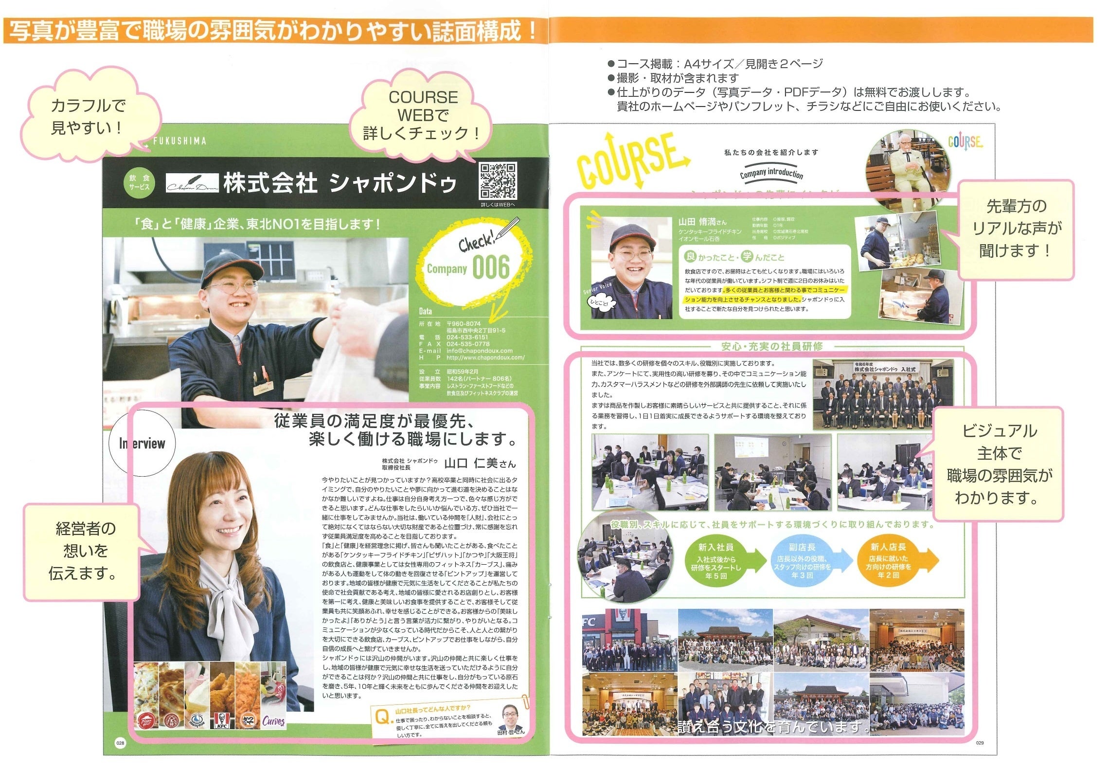 「COURSE福島」は、地元で働きたい学生に地元企業の魅力を伝えるために生まれた、学生と企業をつなぐ就職応援メディアです。これまで誌面やWEBを通して、福島の地元企業200社以上の情報を60,000人以上の県内の学生に伝えてきました。