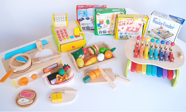 今回寄贈させていただいたのは、鉄琴と鍵盤で2種類の音あそびが楽しめる「森のメロディーメーカー」や、お店屋さんごっこができる「くるくるピッピ!レジスター」、「ジュージューくるりん!キッチン」などのままごとあそびのおもちゃです。これらは、あそびを通してこどもたちのコミュニケーション能力を育むことを目的としています。