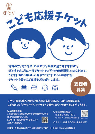 社会福祉法人いぶき福祉会(本部:岐阜県岐阜市、理事長:岡本浩明)が運営するショップ「ほとり」(岐阜市日光町)は、地域の大人が購入したチケットで子どもたちが無料でおやつを楽しめる「こども応援チケット」制度を、2026年1 月より本格始動いたします。
