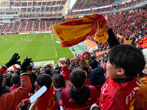 ピッチサイド見学の後は、お待ちかねの試合観戦。試合終了直前でPKのチャンスを獲得し、見事1-0でアビスパ福岡に勝利。32,263名の観客を動員した豊田スタジアムは大いに盛り上がりました。子どもたちはプレゼントされたマフラータオルを回しながら、喜びをわかち合いました。