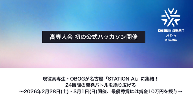 全国の国公私立高専の学生や卒業生(高専人)をつなぎ、社会への価値創造を支援する一般社団法人高専人会(所在地:東京都千代田区、代表理事:渋谷修太、以下「高専人会」)は、2026年2月28日(土)から3月1日(日)にかけて、高専人会として初となるオフィシャルハッカソンを開催いたします。