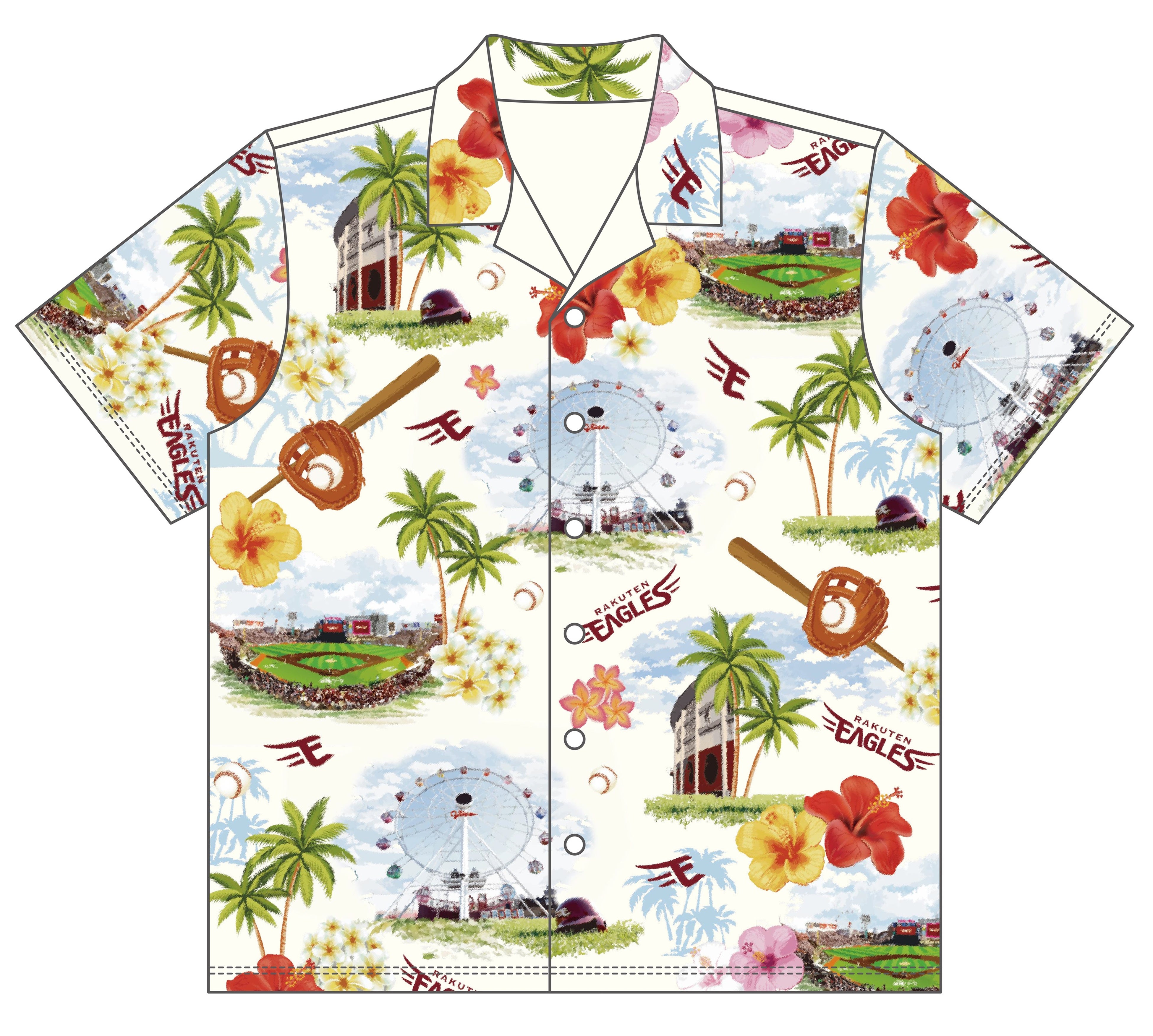 スタジアムなどがデザインされた、夏らしいオリジナルアロハシャツです。
