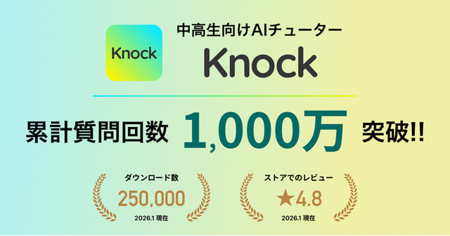 AIチューター「Knock」は、生徒の学習を包括的にサポートするアプリケーションです。スマホで写真を撮るだけでどんな教材にも使えて、ヒントや解説、重要ポイントを示してくれる「AIスキャン」機能は、リリースから1年で25万人を超える中高生、その他学生などに支持されています。